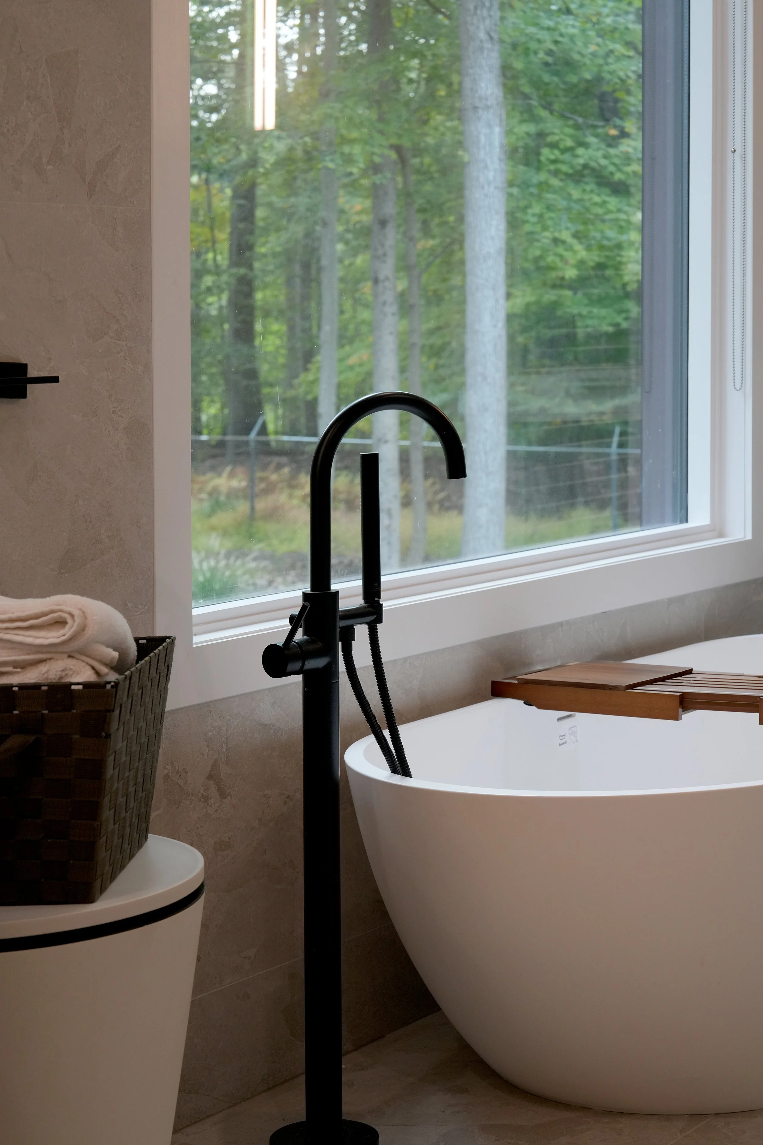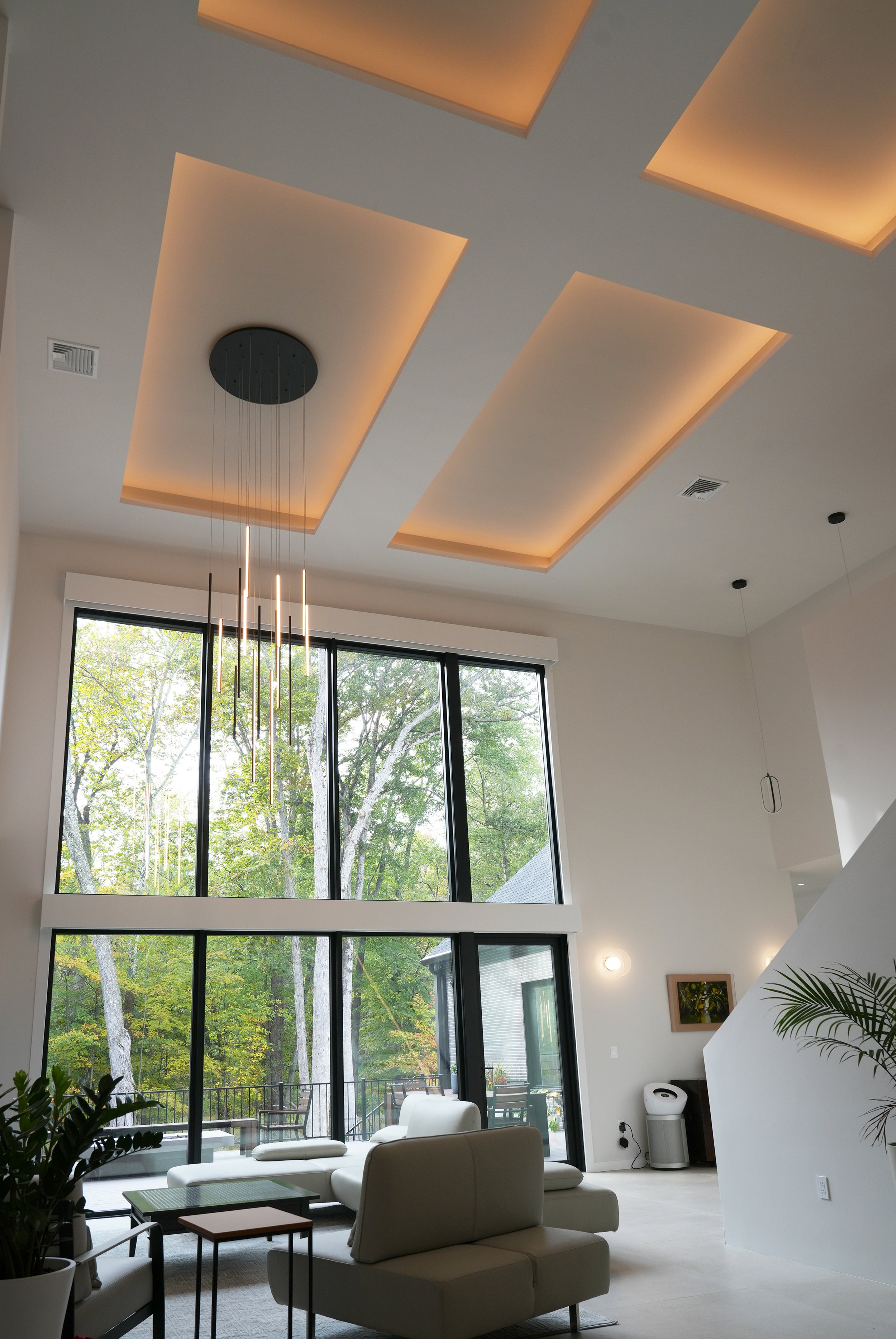 This house, located in a suburban area of New Jersey, was designed with the concept of borrowed scenery in mind, thoughtfully framing the surrounding forest as an integral part of the living space.