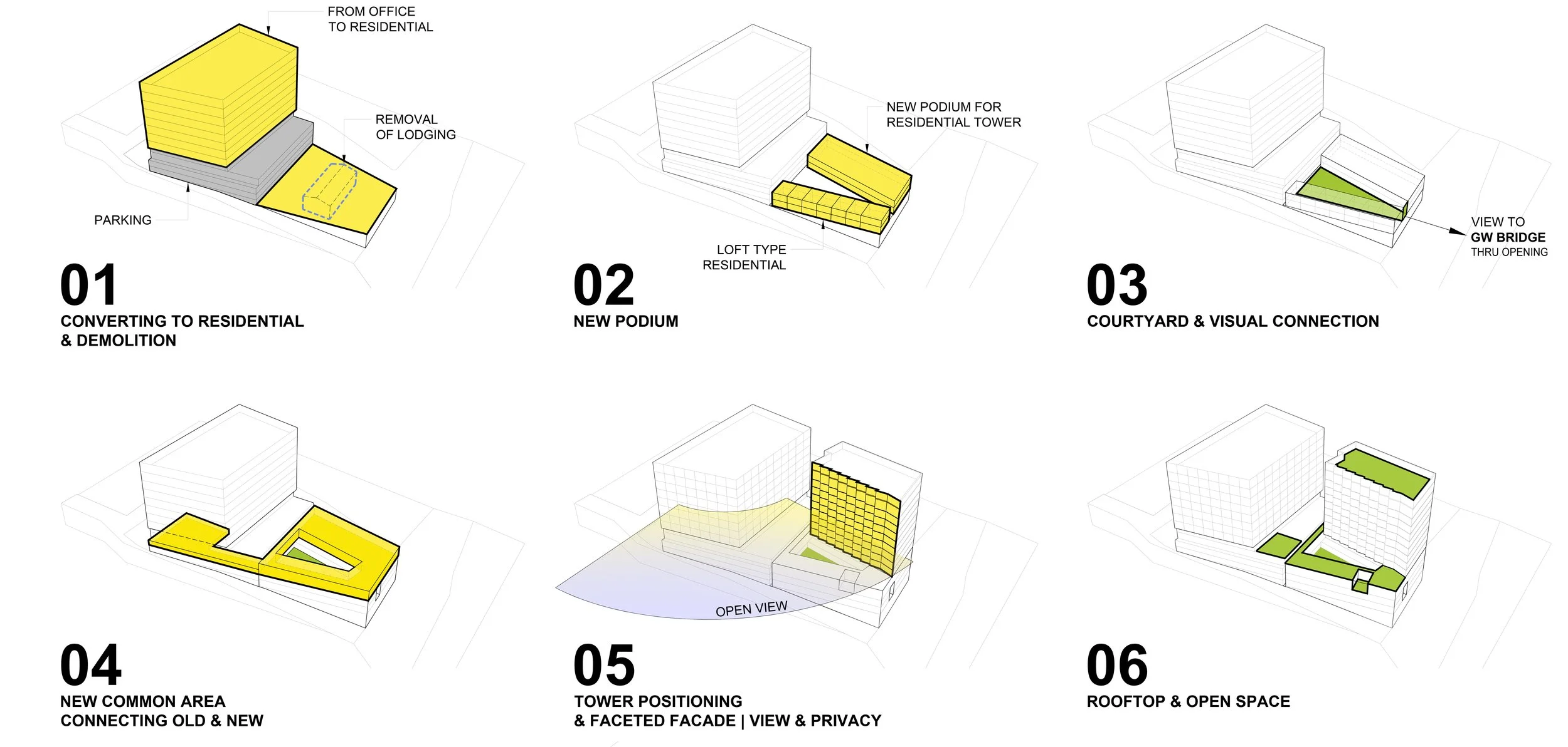 This renovation project also includes the addition of a new tower and podium. The new tower was strategically positioned to respect the existing building and ensure it does not obstruct the view of the bridge. There is a courtyard in between the tower and loft type units. This courtyard will be a tranquil area, shielded from highway noise, offering a sense of neighborhood to the community of tenants. The courtyard is surrounded by the amenity floor on the third floor, connecting the Building A and B. This Creates the big opening toward the bridge.