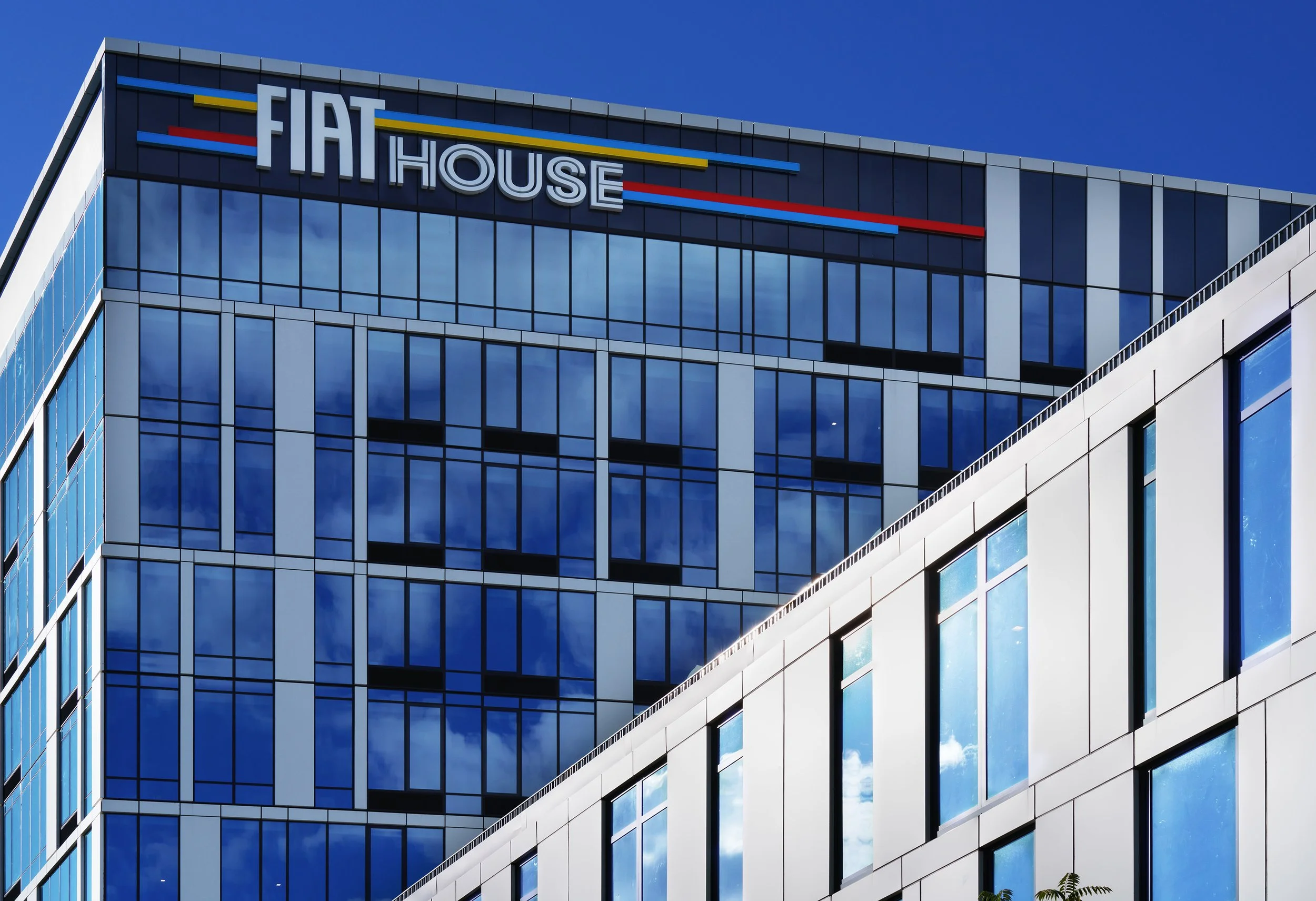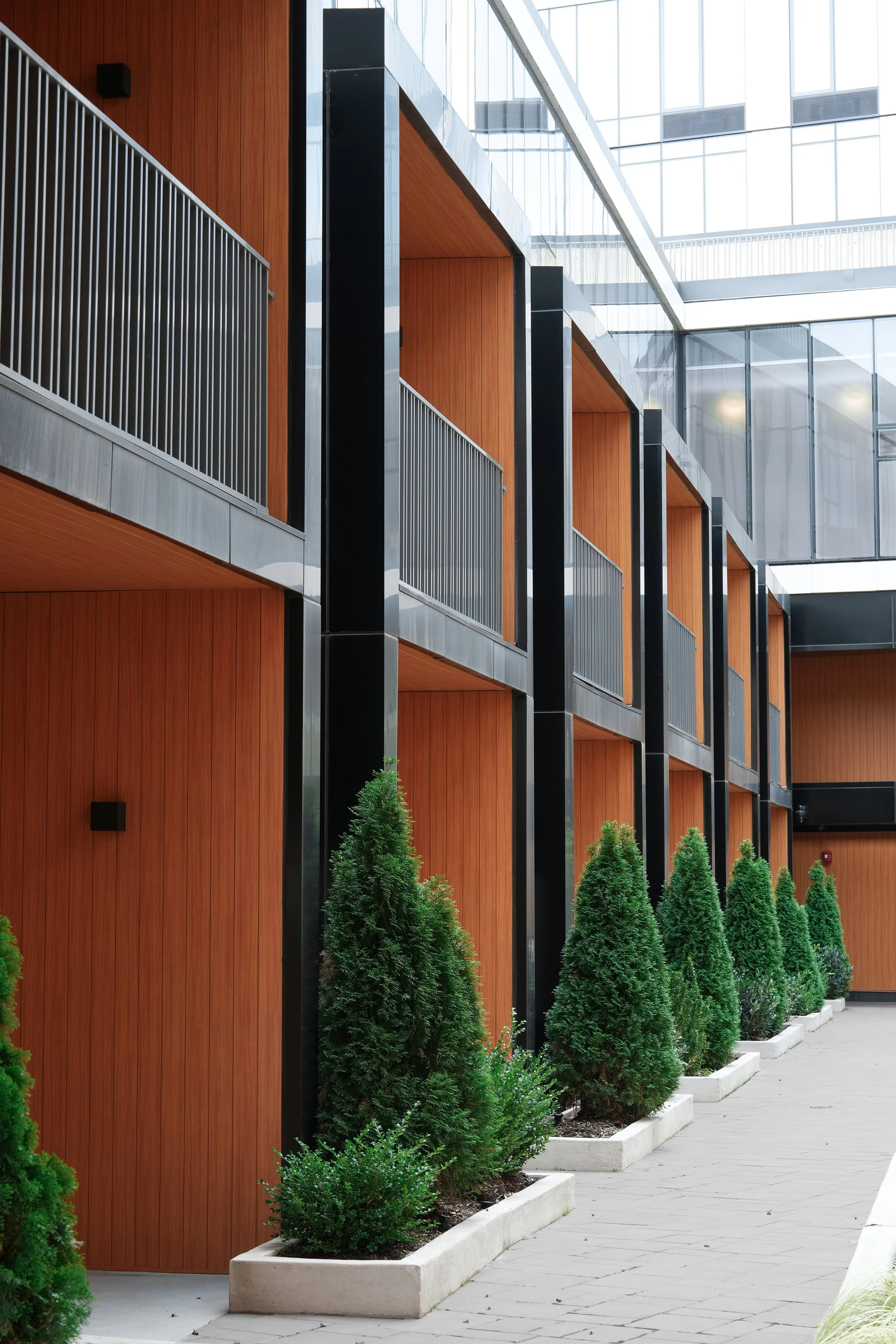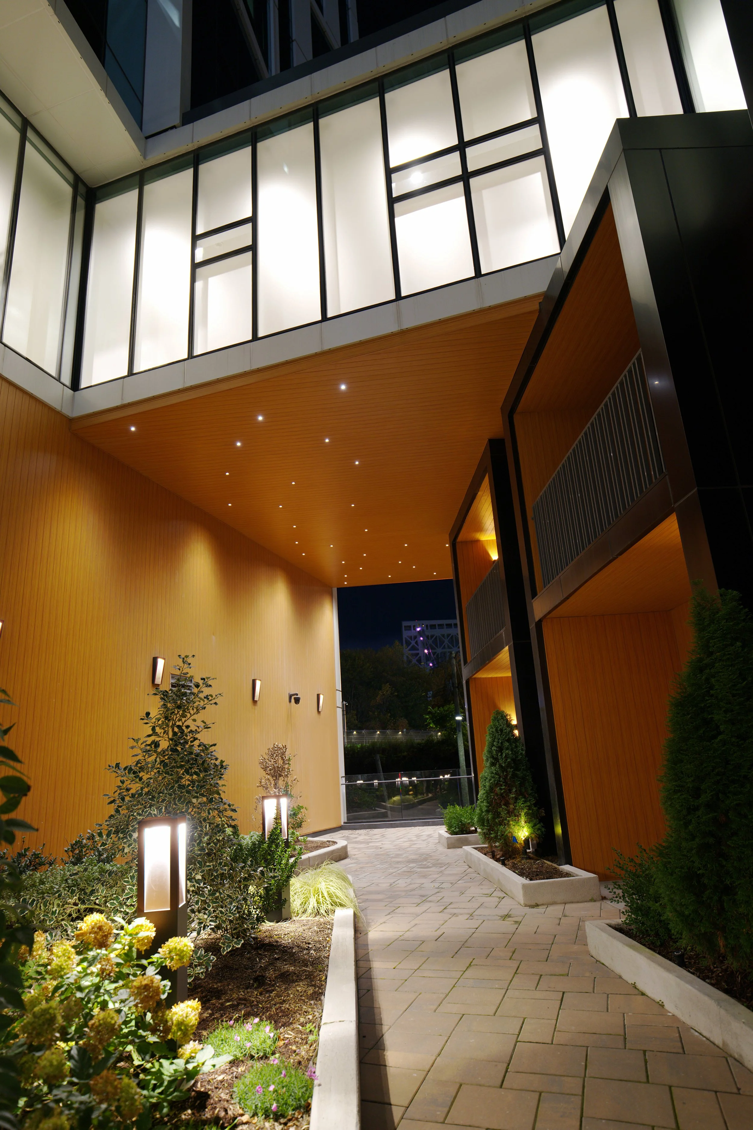 The project features two towers connected by a podium building. Building A involves the renovation of the existing office structure, while Building B is a new construction following the demolition of a small lodge. The site also includes a five-story parking garage, both above and below ground. Portions of this existing garage have been converted into a cozy lobby and amenity spaces.