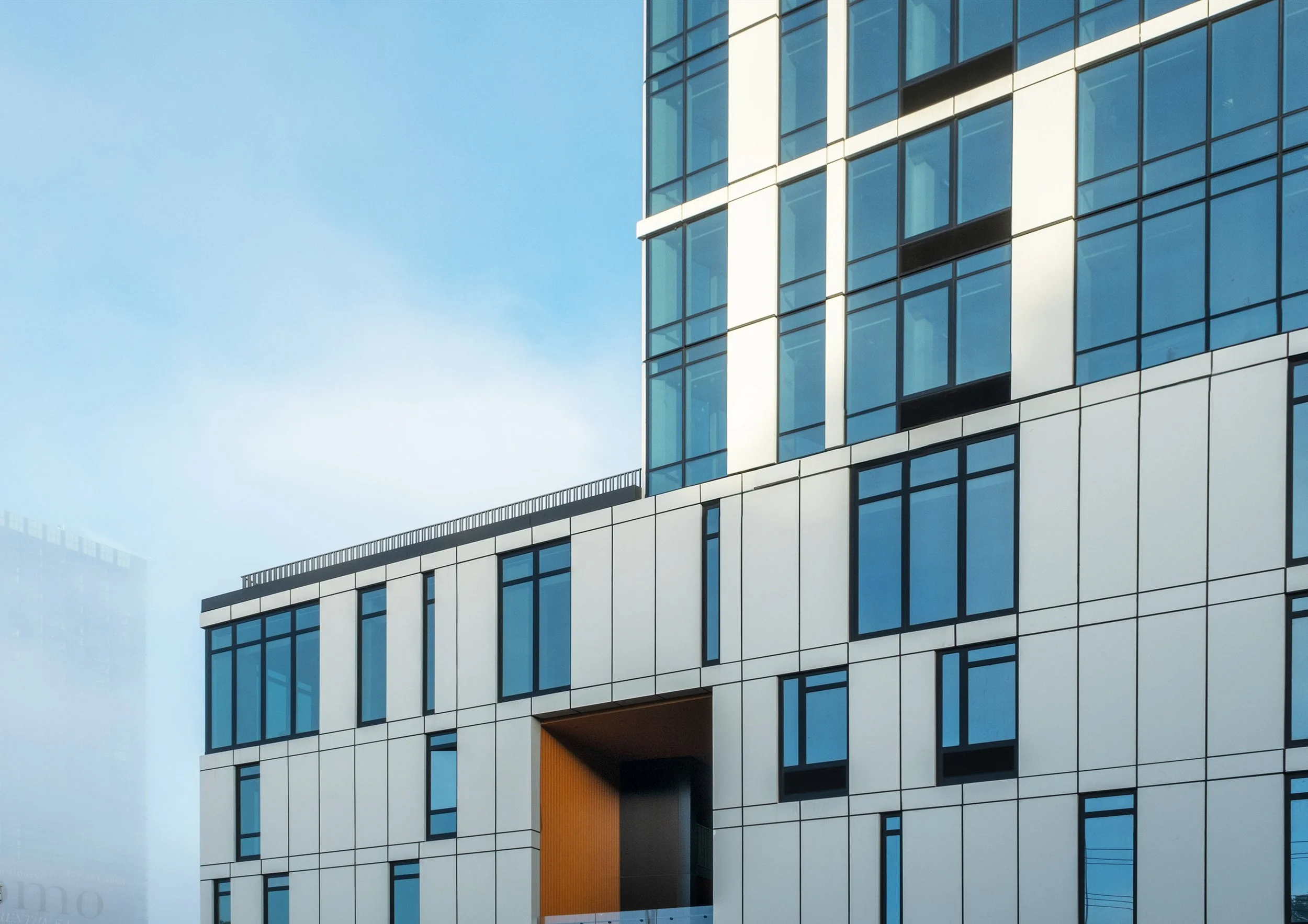 The old, dark, and dated façade was removed and replaced with new energy-efficient curtain walls. This change allows more natural sunlight to flood the living spaces and offers beautiful views. The double-story expression on the façade balances with the scale of the George Washington Bridge, while the vertical and horizontal linear patterns harmonize with the lattice steel structure of the bridge.