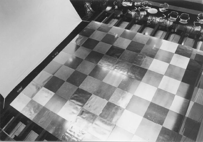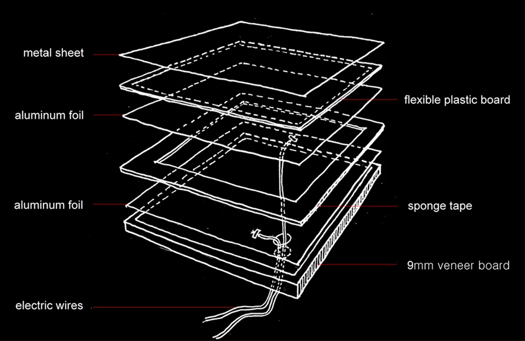 I put 81 touch pressure sensor-attached-panels over the structure. Every time dancers step on each panel, different sounds were generated. Again, our team decided to make the panels on our own for cost reduction. Stage designer Mr.Kim suggested using 9mm veneer boards, sponge tapes, aluminum foils, plastic sheets, metal sheet papers to make the panels.