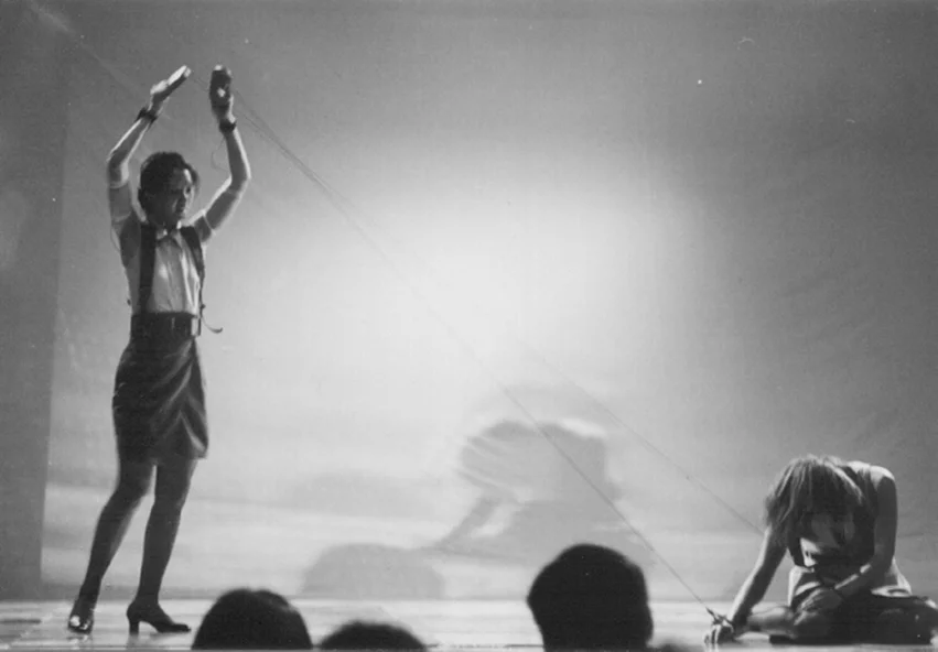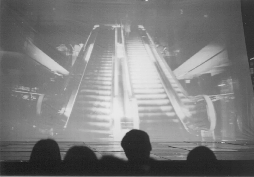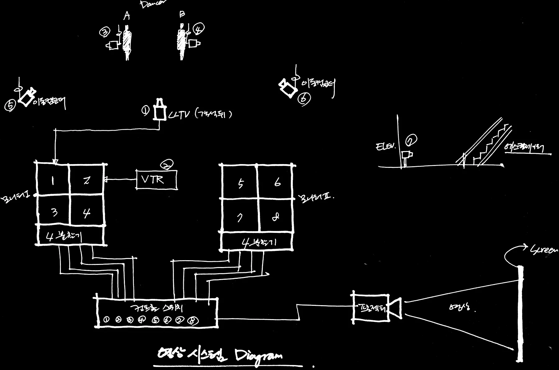 This dance performance is a duo dancing with the theme of the combination of art and technology. Sensor plays music as dancers move and visual images are accompanied throughout this performance. From September 2000 to early December, I attended all idea meeting and videotaped all practices to write time scenario. The performance was carried out on the fountain in POSCO CENTER -the headquarter of world famous steel giant and the most advanced intelligent building in Korea. In order to keep the marble floor of the fountain intact, I decided to lift the stage over the fountain and build stage sub-structure with H-beam which is very affordable and represents corporate image of the steel company.